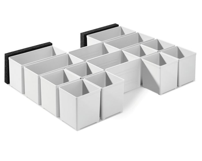 Plastic containers and compartment dividers for customised drawer partitioning; 8 x plastic containers 60 x 60 x 71mm; 4 x plastic containers 60 x 120 x 71mm; 3 x compartment dividers; 2 x bracing pads in a bag.