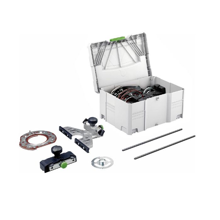Compatible with FESTOOL OF 2200 Plunge Router. Includes guide rail adapter set; parallel side fence with fine adjustment and dust extraction hood; guide rods; Ø 17 mm, Ø 24 mm, Ø 27 mm and Ø 40 mm copying ring, base D36; base for copying rings and extension.