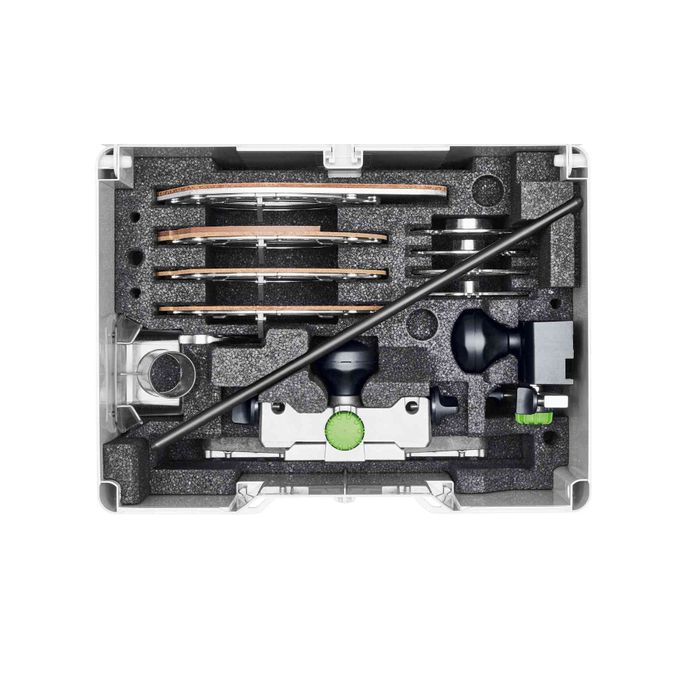 Compatible with Festool OF 2200 Plunge Router. A complete accessory systainer for maximising the potential of the applications that can be achieved with the powerful router. Includes a variety of copy rings and adapters for working with the Guide Rail system.
