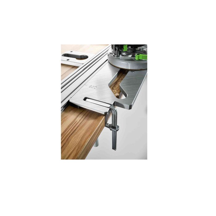 The APS worktop template makes flush connections of wooden panels at a 90° angle simple. The template is permanently fixed to the integrated clamp and thus enables precise results – even when the router passes several times along a single groove.